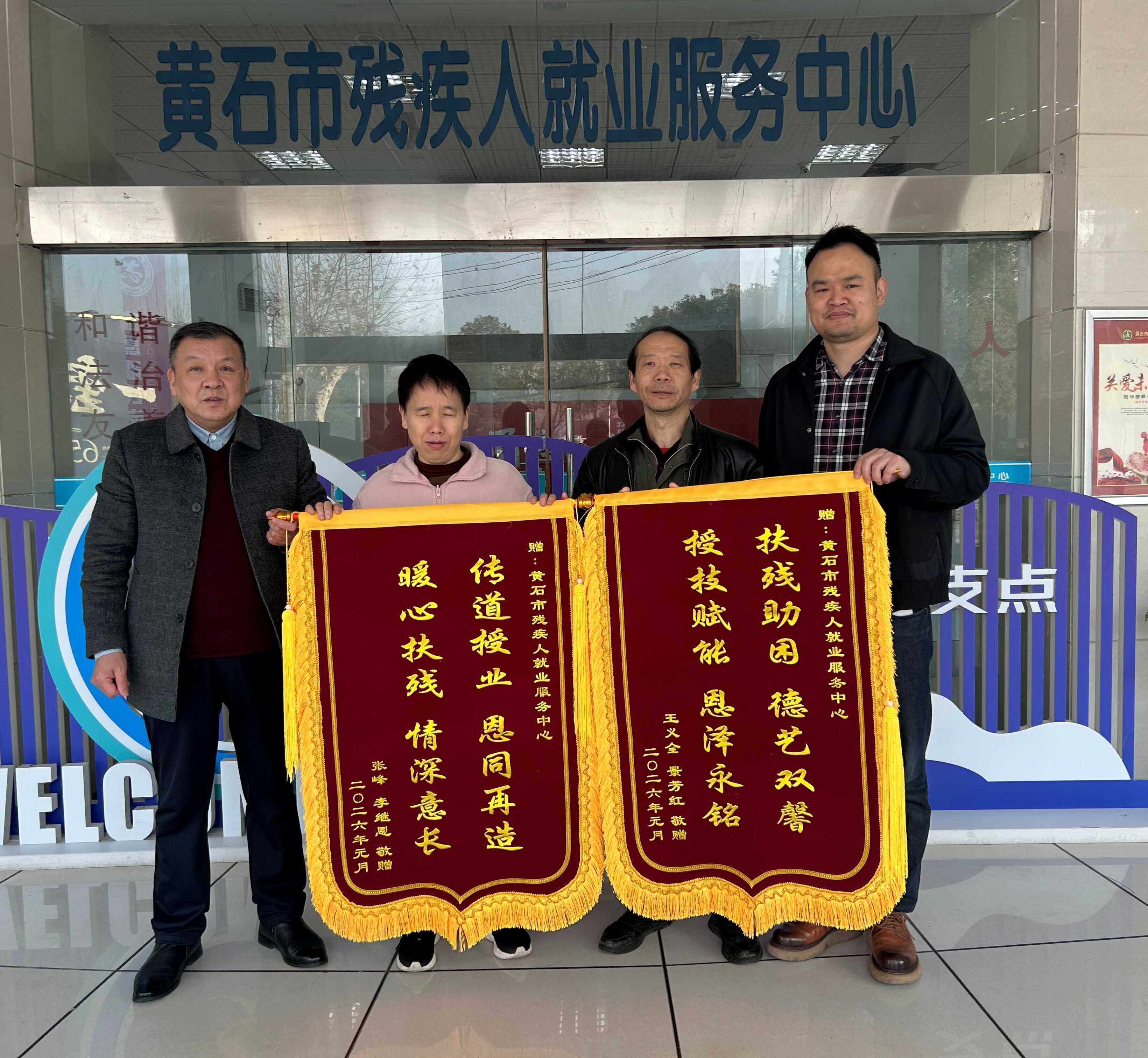 1月15日,市盲协主席李继恩,参训盲人学员张峰、王义全、景芳红向市残疾人就业服务就业中心赠送锦旗,以真挚谢意致敬这份助残赋能的暖心之举。