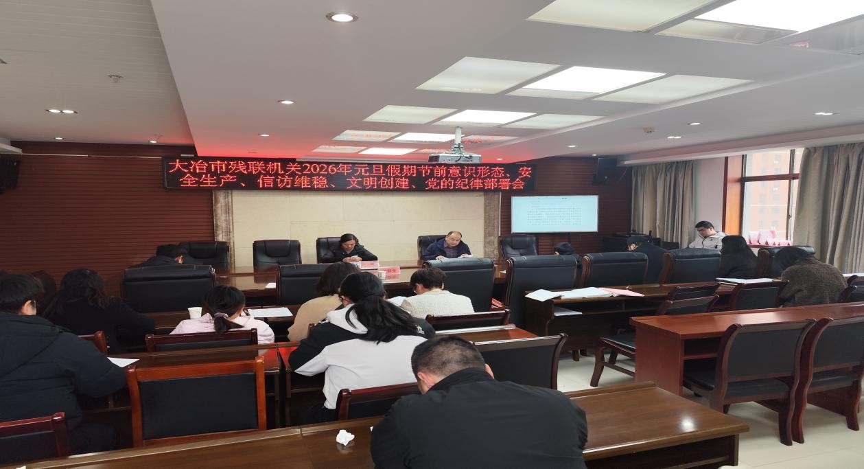 12月31日下午,大冶市残联九楼大会议室气氛热烈,该市残联机关2026年元旦假期节前意识形态、安全生产、信访维稳、文明创建、党的纪律部署会在此召开。会议由大冶市残联党组成员、副理事长雷国华主持,机关全体党员干部职工参会。