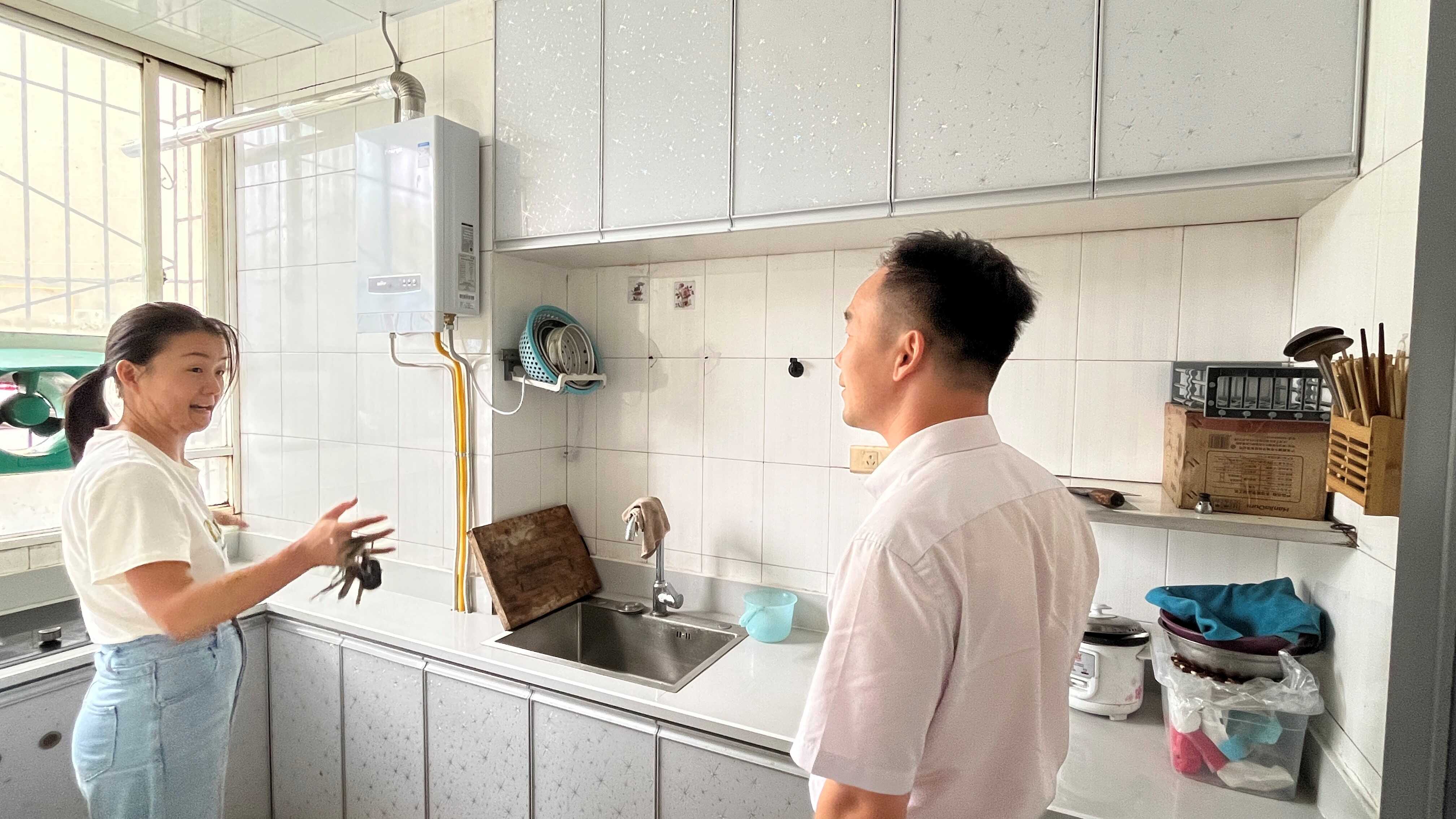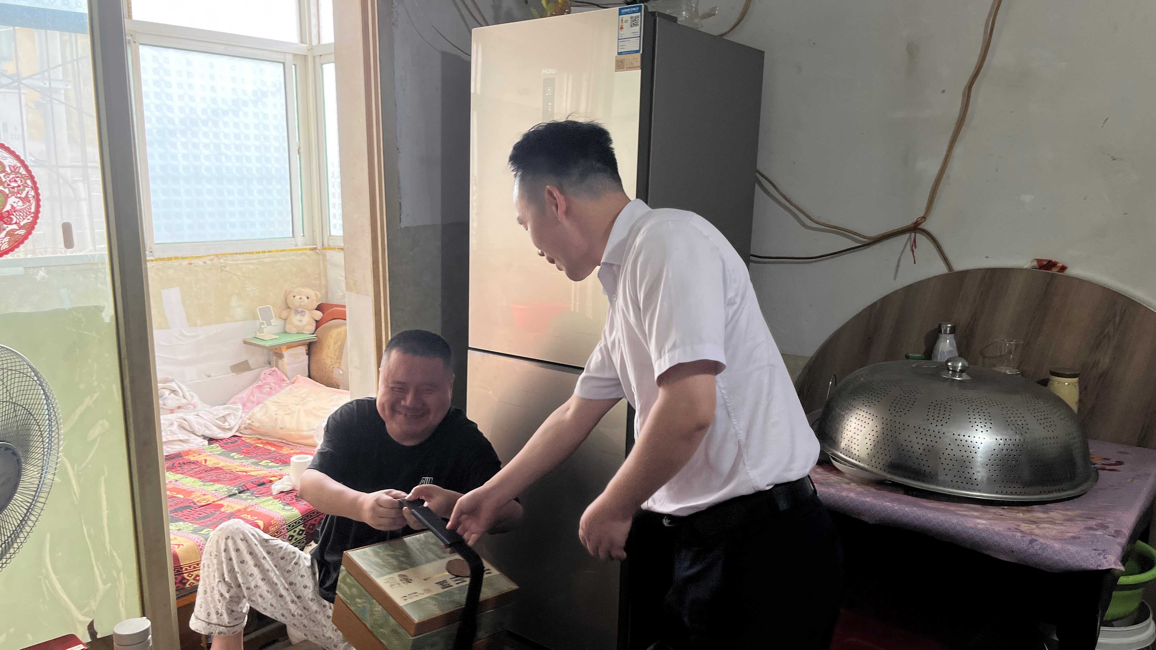 市残联党组成员、副理事长李名钊(右)察看困难残疾人家庭无障碍改造情况